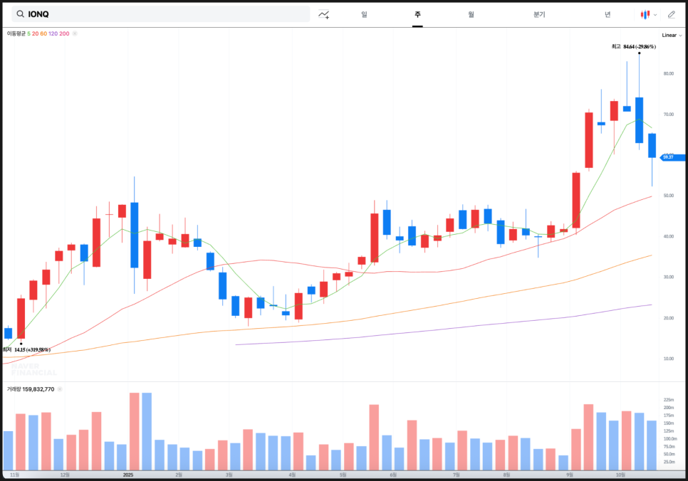 IONQ 일봉은 9월 중순 이후 가파르게 상승해 고점 84.54달러를 기록했지만, 이후 단기 이평선(5일선, 20일선)을 이탈하며 빠르게 조정세로 전환했습니다. 거래량이 정점을 찍은 이후 점진적으로 줄어들면서 매수세가 식고 있는 흐름도 눈에 띕니다. 현재 주가는 60일선 부근까지 내려왔고, 단기 하락 추세가 이어지고 있는 상황입니다. 기술적으로는 과매수 구간을 소화하는 전형적인 눌림 조정으로 보이지만, 반등 시 매물 부담이 강하게 작용할 수 있는 자리이기도 합니다.