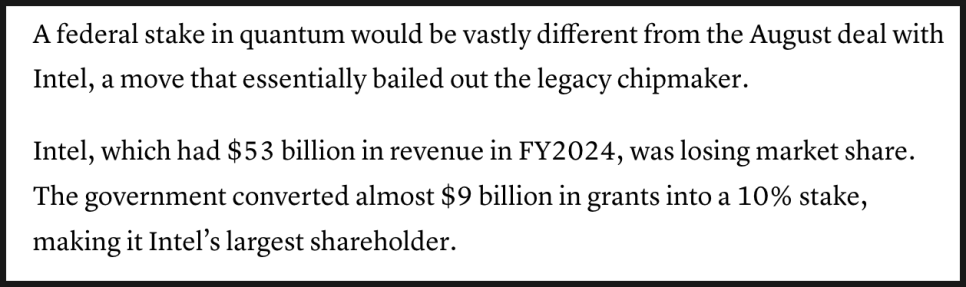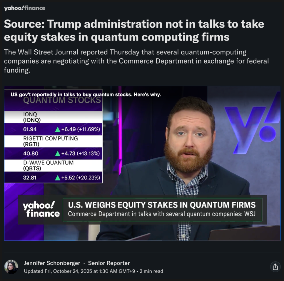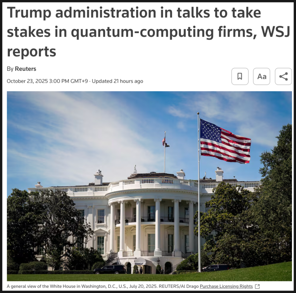 보도에 따르면, 정부가 협상을 진행하고 있지는 않지만 양자컴퓨팅 기업들이 백악관에 지분 투자 제안을 먼저 타진하고 있다는 것입니다. 이는 정부가 아니라 기업 쪽에서 먼저 움직이고 있다는 뜻이며, 향후 정책 방향에 따라 지분 매입 혹은 워런트·대출 등 우회적 투자 방식으로 발전할 가능성을 시사합니다.