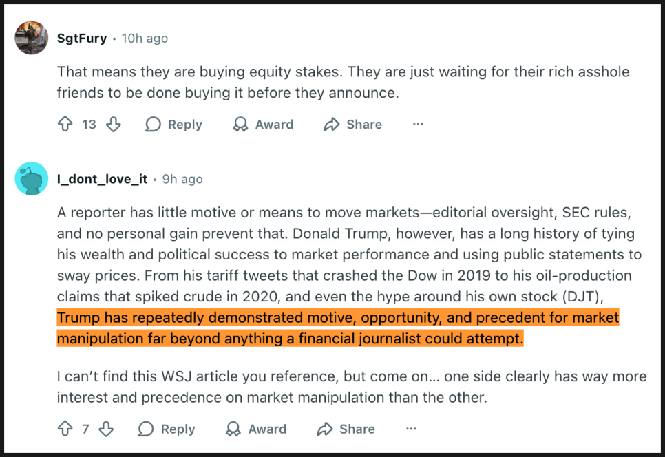 이후 Yahoo Finance의 보도가 나오자 Reddit의 투자 커뮤니티에서도 분위기가 다시 한 번 뒤집혔습니다. 처음 The Wall Street Journal(WSJ)의 보도가 나왔을 때는 “정부 개입 확대”에 대한 비판 여론이 우세했지만, 이번에는 “공식 부인 자체를 믿을 수 없다”는 반응이 대다수를 차지했습니다.