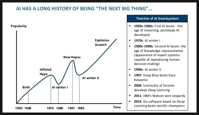 AI도 1950년대부터 “세상을 바꿀 기술”로 주목받았지만, 실제 상용화와 경제적 성과는 훨씬 뒤늦게 나타났습니다. 두 차례의 AI 겨울을 거치면서 과도한 기대와 실망이 반복됐고, 진짜 폭발적 성장은 2010년대 딥러닝이 상용화되면서부터 시작됐습니다.