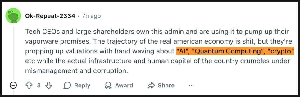 또한 “이 행정부는 기술 기업과 대주주들에게 휘둘리고 있다”는 구조적 불신도 반복적으로 제기됐습니다. “AI, 양자컴퓨팅, 크립토 같은 유행어로 가치를 부풀리고, 그 뒤에 부자들의 자금 회수가 기다리고 있다”는 분석도 눈에 띄었습니다.