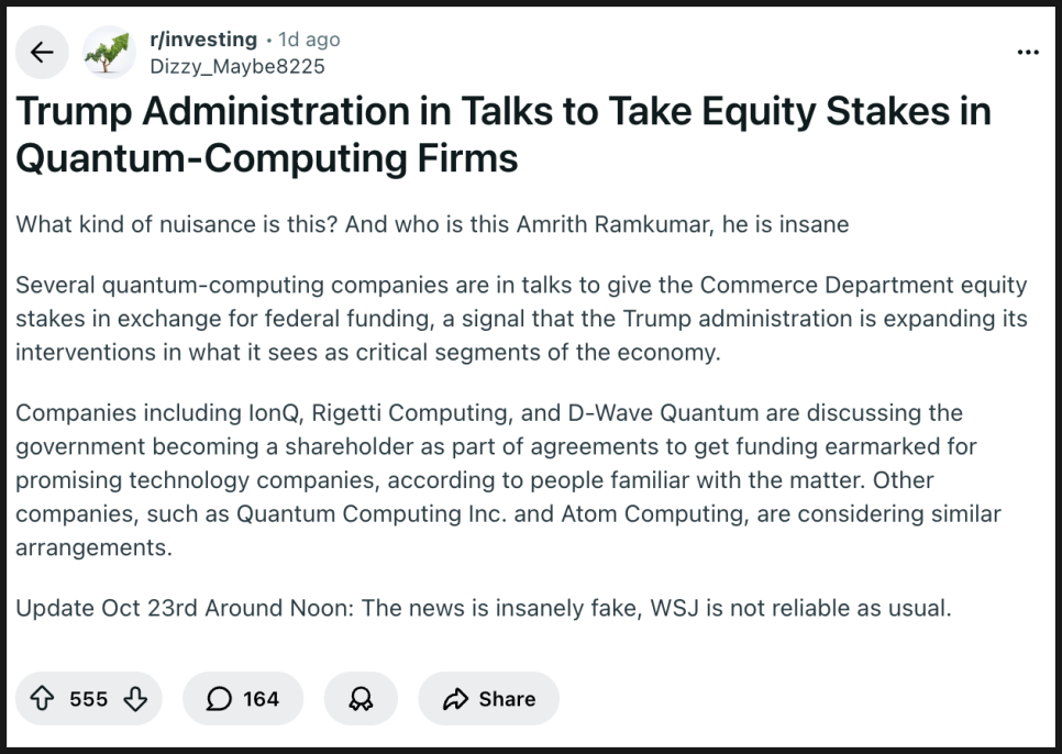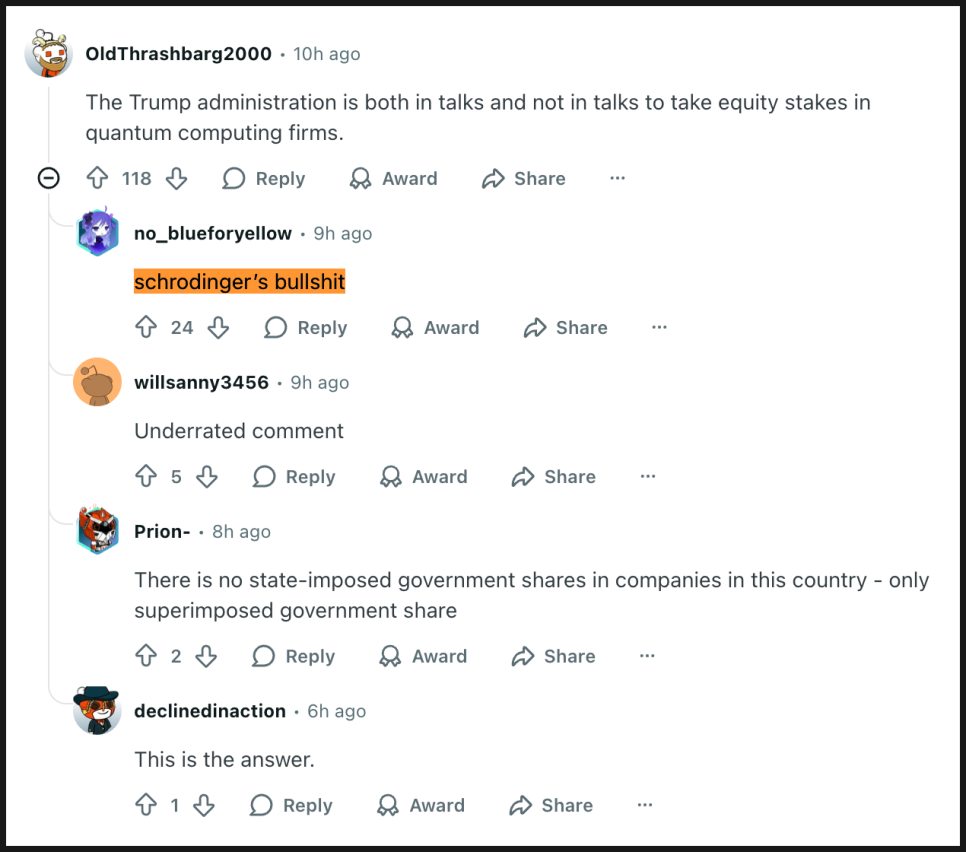 이번 사안이 Reddit 투자 커뮤니티에서도 뜨겁게 논의되고 있습니다. 특히 r/investing 스레드에서는 The Wall Street Journal(WSJ)의 보도 신뢰성, 트럼프 행정부의 개입 방식, 그리고 양자컴퓨팅 산업 자체에 대한 회의론이 동시에 터져 나왔습니다.