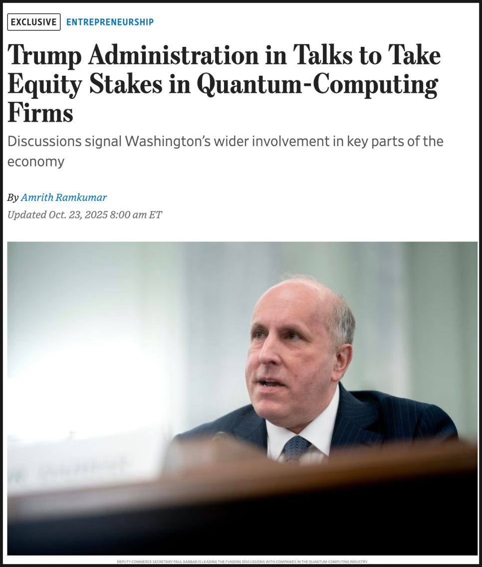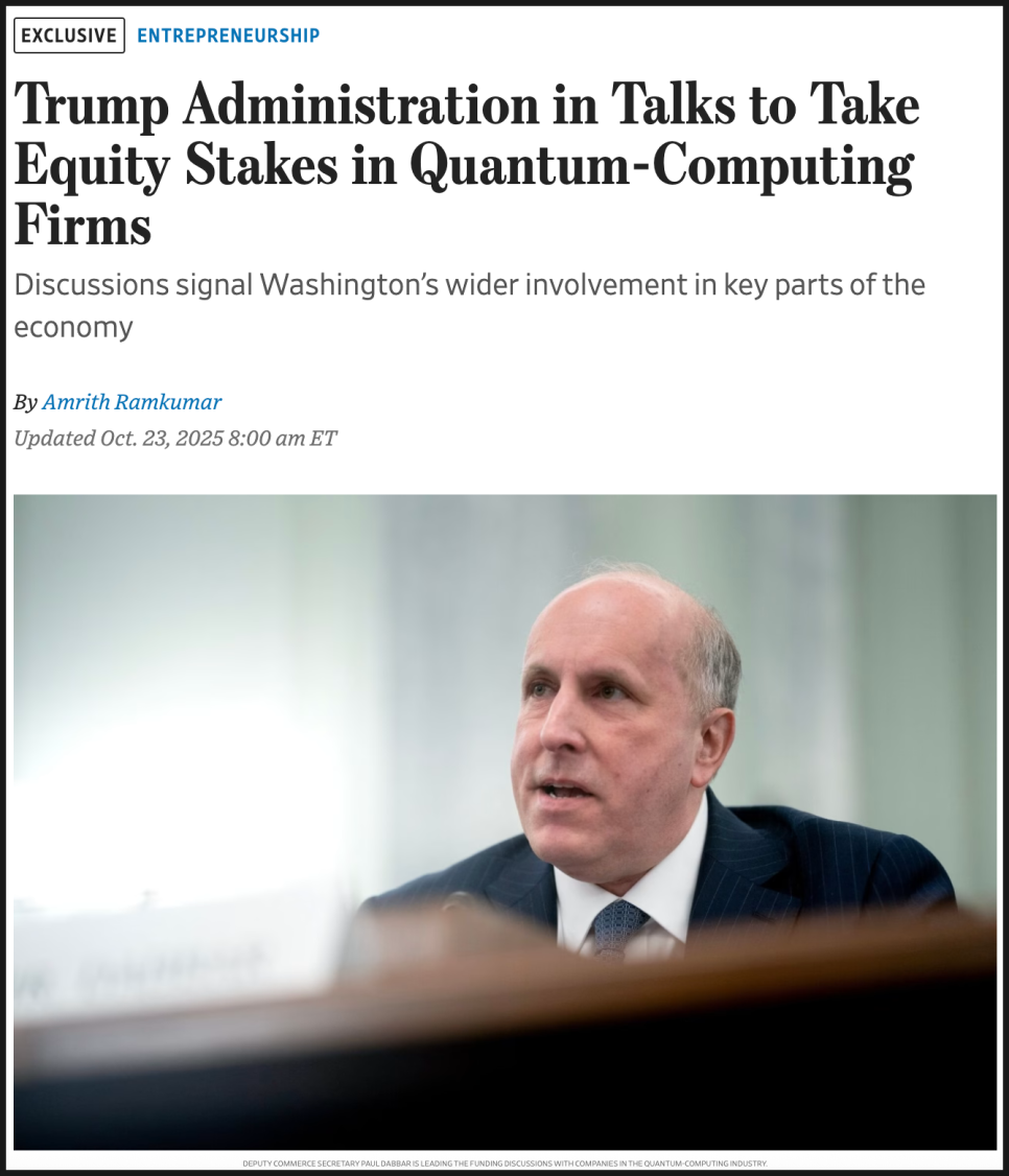 10월 22일(미국 시간) 저녁, 월스트리트저널은 U.S. Department of Commerce(미국 상무부)가 주요 양자컴퓨팅 기업과 최소 1천만 달러 규모의 지분 투자 협상을 진행 중이라고 단독 보도했습니다.