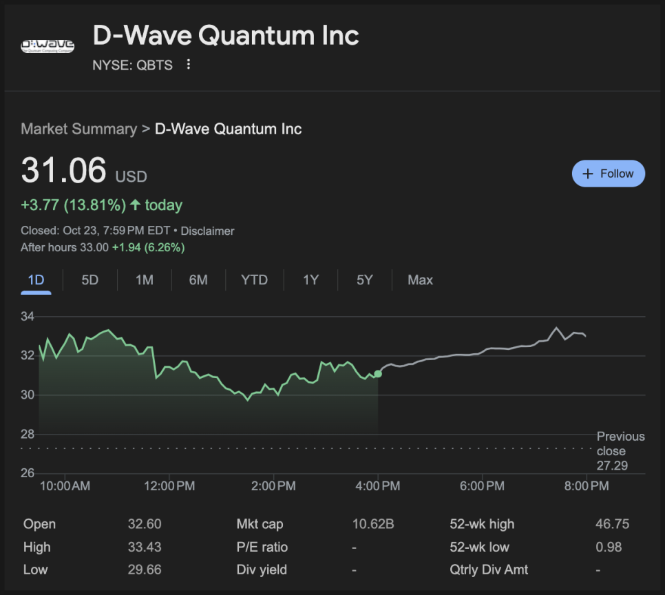 디웨이브 퀀텀(QBTS) 주가는 13.8%로 가장 큰 폭으로 상승한 뒤 6% 추가 상승했고,