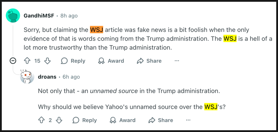 한편 일부 사용자들은 The Wall Street Journal의 보도를 옹호했습니다. “WSJ가 거짓말할 이유가 없다. 트럼프 행정부의 말보다 WSJ를 믿겠다”는 반응이 다수였고, “정말 거짓이라면 기자는 해고됐을 것”이라며 신뢰를 강조하는 댓글도 있었습니다.
