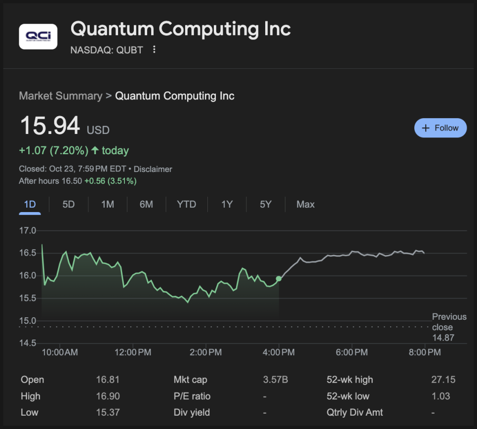 퀀텀 컴퓨팅(QUBT)도 비슷한 흐름을 보였습니다. 7.2% 상승하고 3.5% 추가 상승했죠.