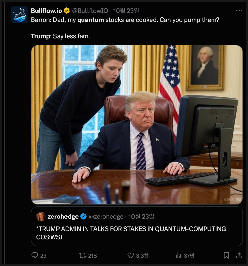 Barron: Dad, my quantum stocks are cooked. Can you pump them? (“아빠, 내 양자주식 망했어. 주가 좀 띄워줄 수 있어?”)