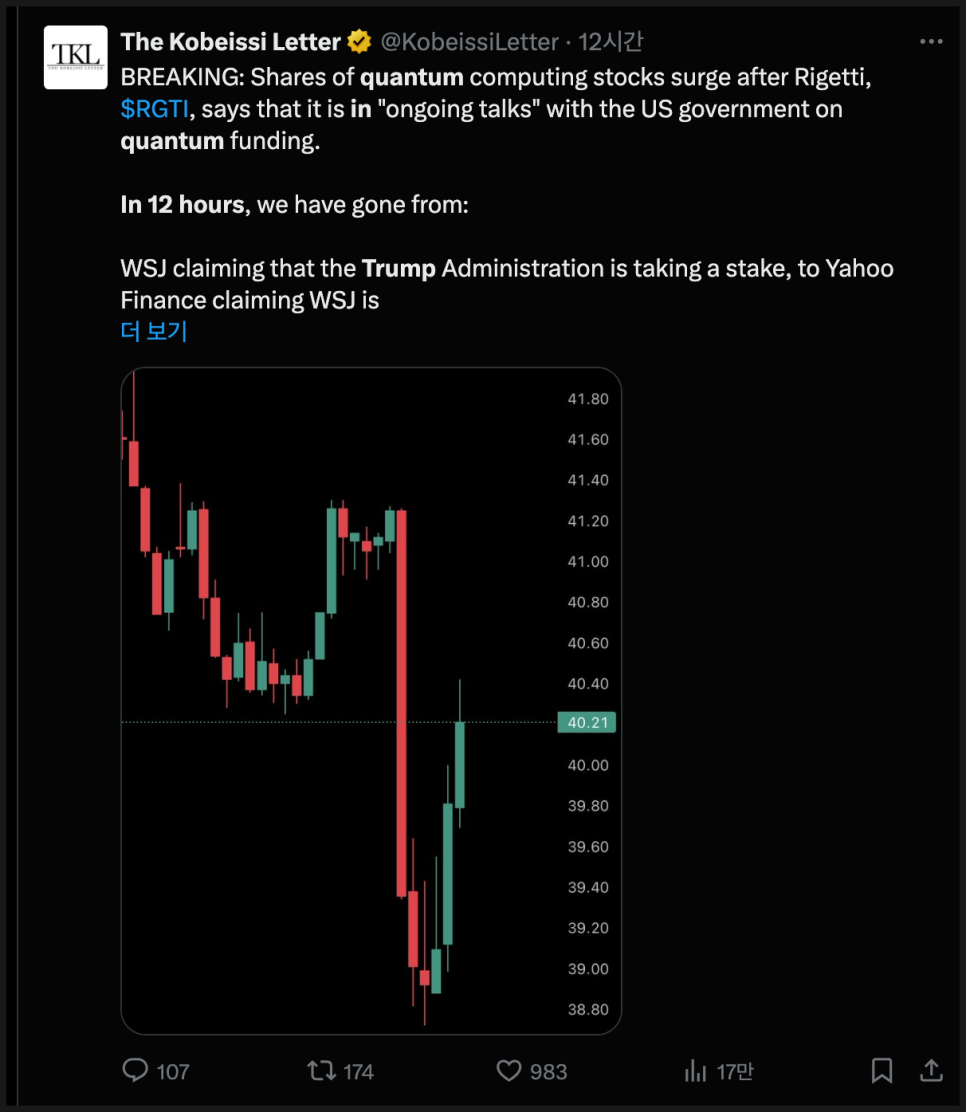 이 시점에서 시장은 혼란스러워졌습니다. 월스트리트저널의 보도는 구체적이었고, 협상 주체와 금액까지 언급됐지만 정부는 이를 전면 부인했기 때문입니다. 그 결과 양자컴퓨팅 관련주 주가는 급등 후 한때 상승폭이 줄어드는 혼조세를 보였습니다.