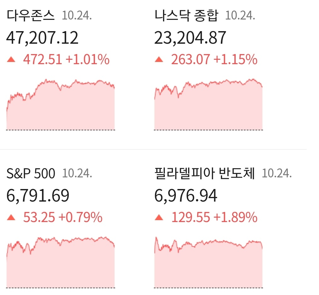 다우지수는 전일 대비 +1.01% 오른 47,207.12에 거래를 마쳤으며, 대형주 중심의 S&P500 지수는 전장 대비 +0.79% 상승한 6,791.69에 장을 마감하였습니다. 기술주 중심의 나스닥 지수는 전 거래일 애비 +1.15% 상승한 23,204.87에 거래를 마치며 장을 마감하였습니다.