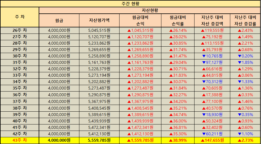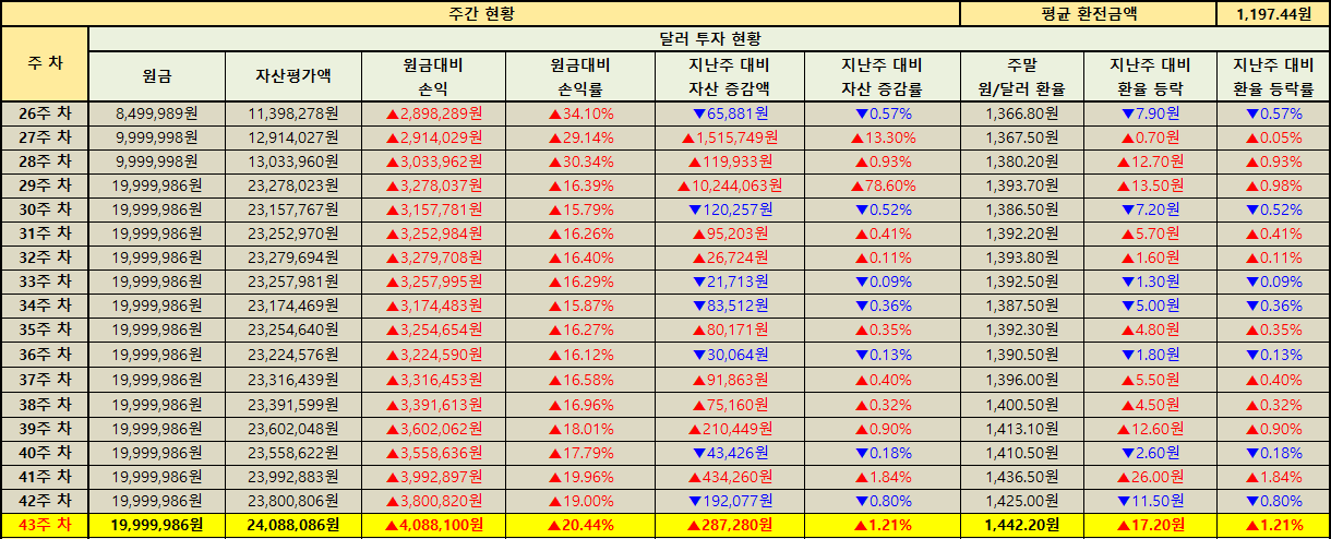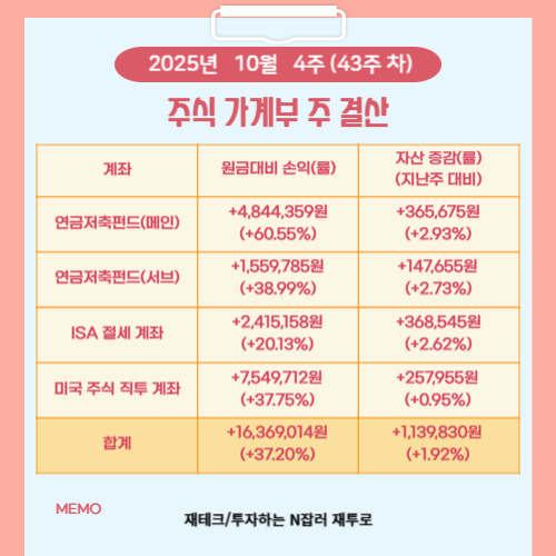 이번 주도 한 주간의 자산 흐름을 정리해 보았습니다. 10월 4주 차 시장은 방향성 없이 등락을 반복했지만 제 포트폴리오는 전반적으로 안정적인 흐름을 이어갔습니다. 장기 투자 관점에서 보면 단기적인 등락보다 구조적인 균형이 잘 유지되고 있다는 점이 더 중요하다고 생각합니다.