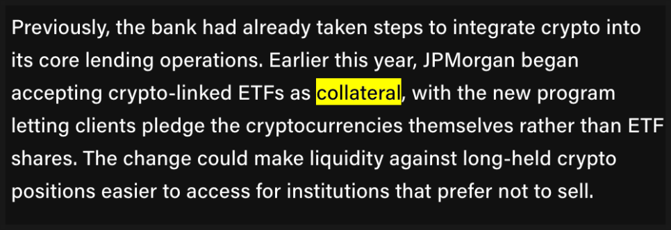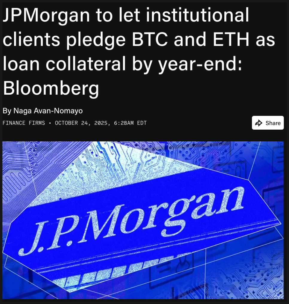 정치적 이슈만 있었던 건 아닙니다. 금융계에서도 매우 상징적인 움직임이 나왔습니다. JP모건 체이스가 2025년 연말까지 기관 고객이 보유한 비트코인과 이더리움을 대출 담보로 활용할 수 있도록 허용하겠다고 발표한 겁니다.