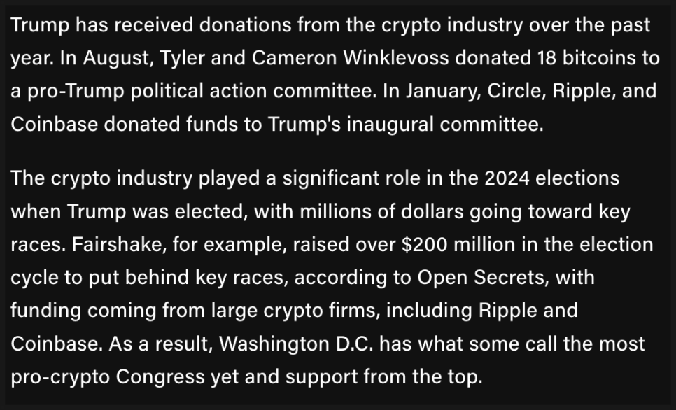 이 사건의 핵심은 ‘정치적 후원’입니다. 암호화폐 업계는 2024년 대선에서 막대한 자금을 선거에 투입하며 이미 워싱턴 정가에서 강력한 영향력을 보여줬습니다. 대표적인 친(親)암호화폐 정치자금 단체인 페어셰이크(Fairshake)는 2억 달러 이상을 모금해 특정 후보와 선거구에 투입했습니다. 이런 후원이 이어지면서 현재 의회는 미국 역사상 가장 친암호화폐 성향이라는 평가를 받고 있습니다.