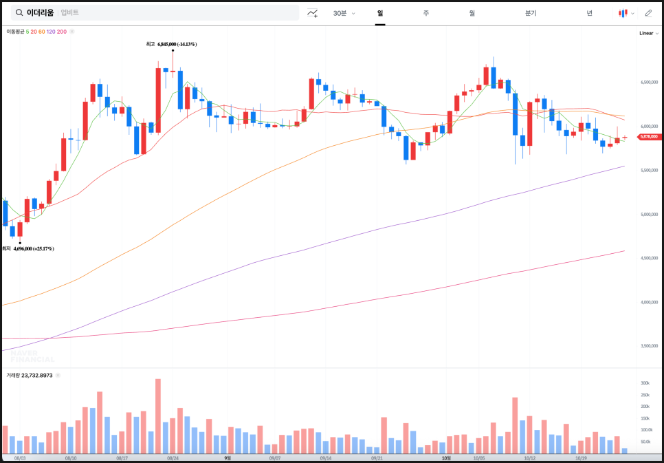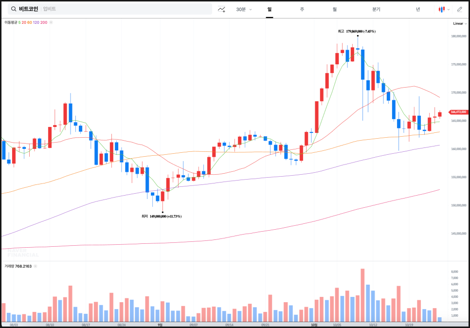 비트코인은 8월 중순 1억 4900만 원대에서 반등해 10월 초 1억 8000만 원 부근까지 상승했습니다. 60일선과 120일선을 뚫고 올라가며 뚜렷한 추세 전환 신호를 보여줬죠. 하지만 고점 이후 단기 조정이 이어졌고, 현재는 20일선과 60일선 사이에서 지지를 받으며 횡보하는 모습입니다.