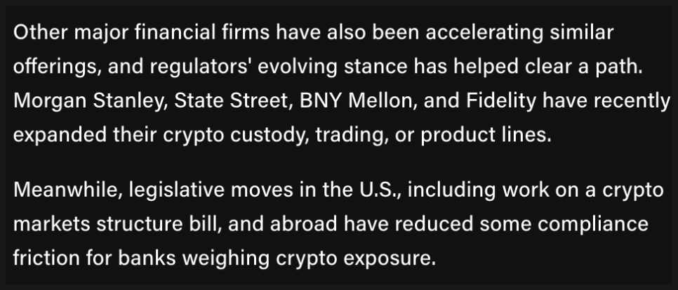 JP모건의 결정은 단독 행동이 아닙니다. 모건 스탠리(Morgan Stanley), 스테이트 스트리트(State Street), BNY 멜론(BNY Mellon), 피델리티 인베스트먼츠(Fidelity Investments) 등 주요 금융기관들도 이미 비슷한 방향으로 움직이고 있습니다. 점점 더 많은 은행과 자산운용사가 암호화폐를 ‘진지하게’ 다루기 시작한 셈입니다.