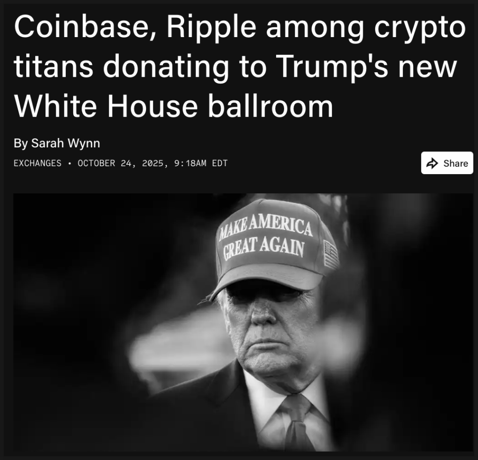 첫번째 소식은 트럼프 대통령의 백악관 무도회장 증축 계획입니다. 여러 매체에 따르면 코인베이스, 리플, 테더, 제미니 창업자 등 주요 암호화폐 기업과 인물들이 여기에 후원자로 참여했다고 합니다.