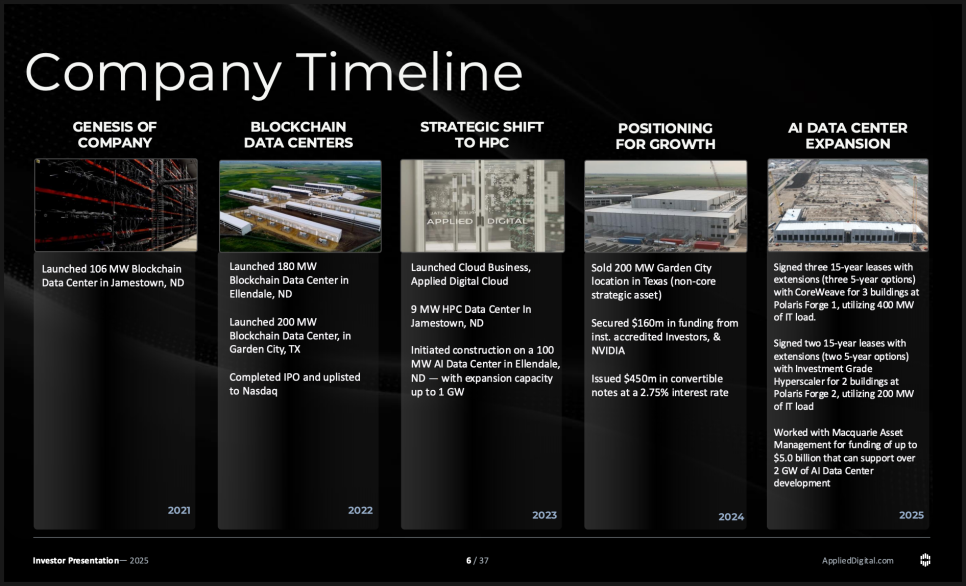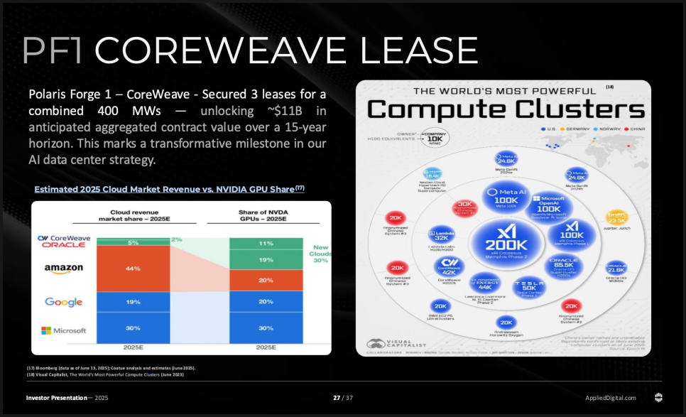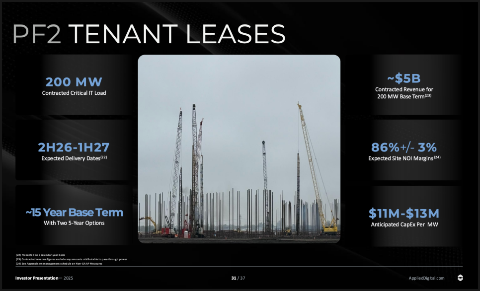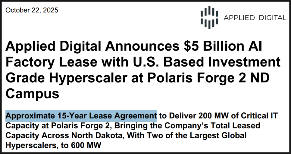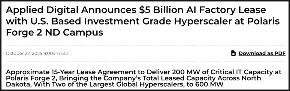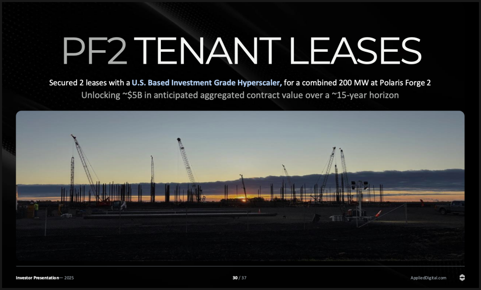 2025년 10월 22일, 어플라이드 디지털은 자사의 신규 데이터센터 단지인 ‘폴라리스 포지 2(Polaris Forge 2)’ 캠퍼스에서 미국의 투자등급 하이퍼스케일러와 50억 달러 규모의 장기 임대 계약을 체결했다고 발표했습니다.