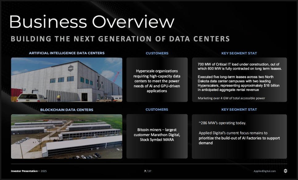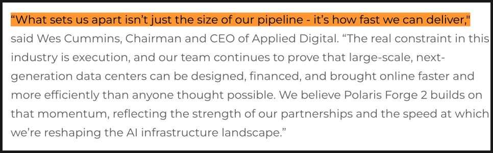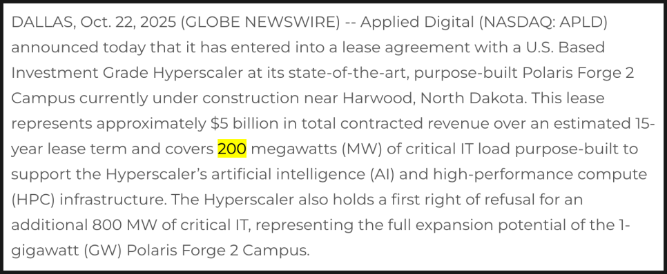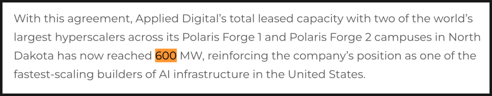 이 한 건의 계약으로 어플라이드 디지털이 현재 노스다코타에서 확보한 총 임대 용량은 600MW에 달하게 됐습니다. 계약 상대는 단 2곳의 세계적인 하이퍼스케일러입니다. 이는 매우 이례적이고 강력한 신호로 받아들여지고 있습니다.