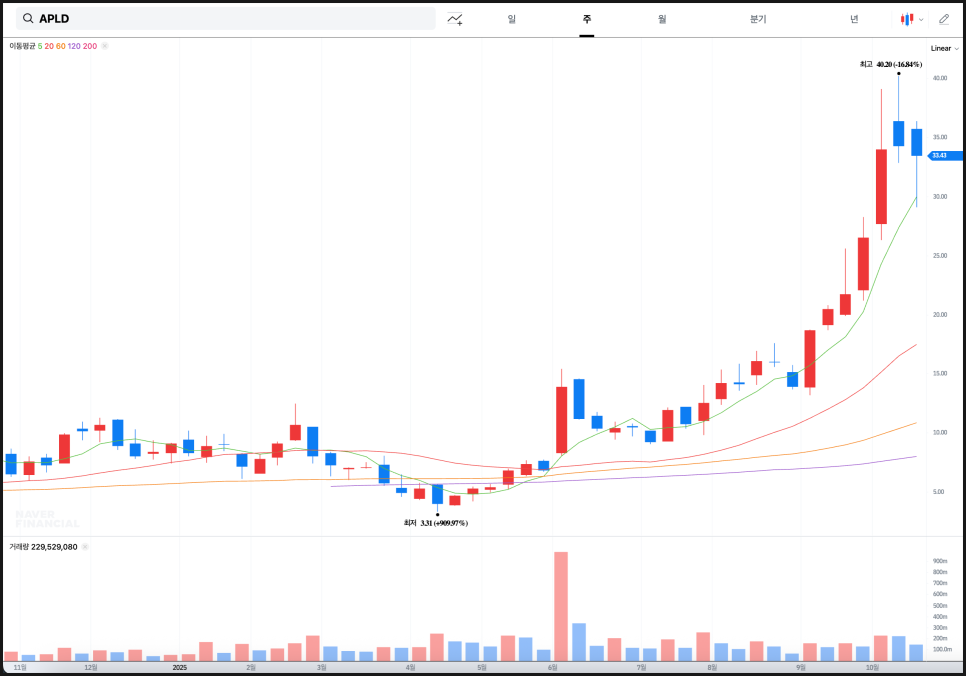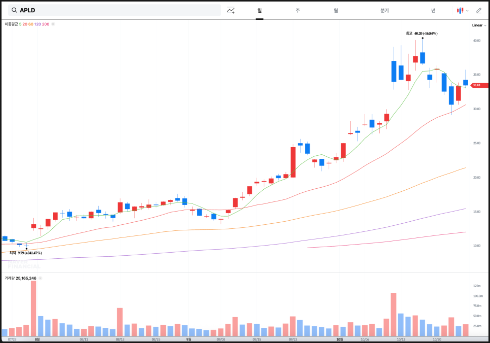 APLD 주가 일봉 차트를 보면 주가는 4월 초 약 3달러 초반의 저점을 찍은 이후 완만하게 상승세를 타다가, 9월부터 본격적인 상승 랠리에 진입했습니다. 10월 중순에는 40.20달러까지 치솟으며 단기간에 10배 이상 급등했습니다. 이런 급등 구간에서는 거래량도 눈에 띄게 증가했는데, 특히 9월 말부터 10월 초 사이 거래량이 폭발적으로 늘어난 점이 눈에 띕니다. 이는 기관이나 큰손 자금이 본격적으로 진입했을 가능성을 시사합니다.