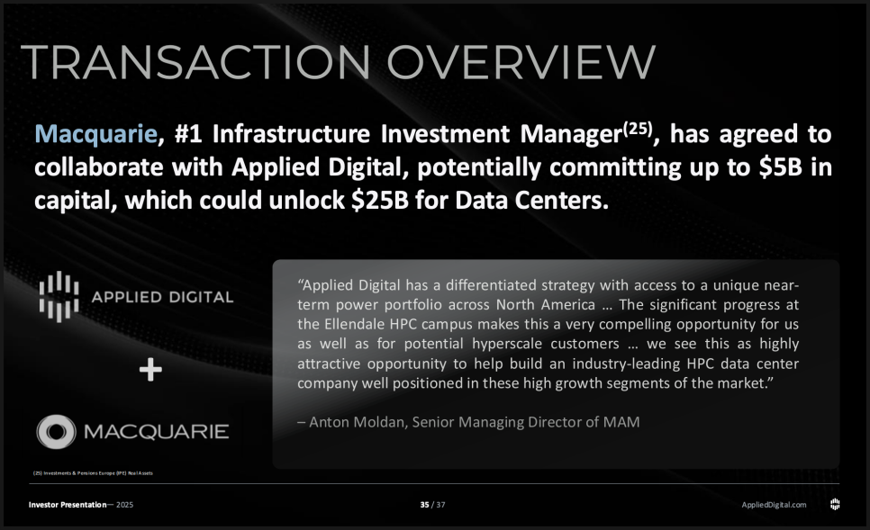 또한 이번 계약은 어플라이드 디지털이 최근 보이고 있는 가파른 확장 흐름의 연장선상에 있습니다. 앞서 코어위브(CoreWeave)와 150MW 규모의 임대 계약을 체결했고, 맥쿼리 자산운용(Macquarie Asset Management)과 50억 달러 규모의 AI 인프라 금융 파트너십도 맺었습니다.