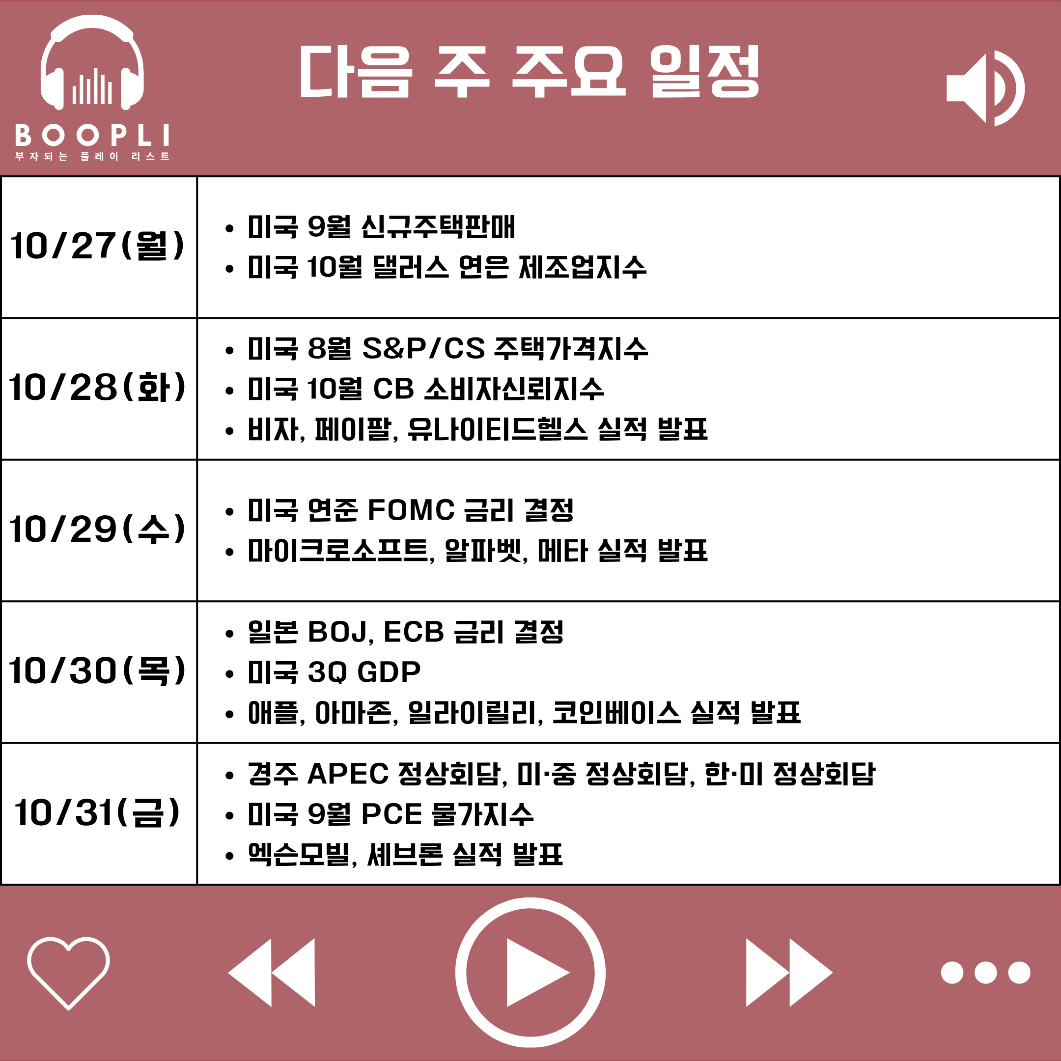 다음 주 미국 증시는 3분기 주요 빅테크 기업들의 실적 발표, 연준의 FOMC 금리 결정, 그리고 경주 APEC에서 열리는 미·중 정상회담 등 핵심 이벤트가 집중되면서 큰 변동성을 보일 가능성이 있다.