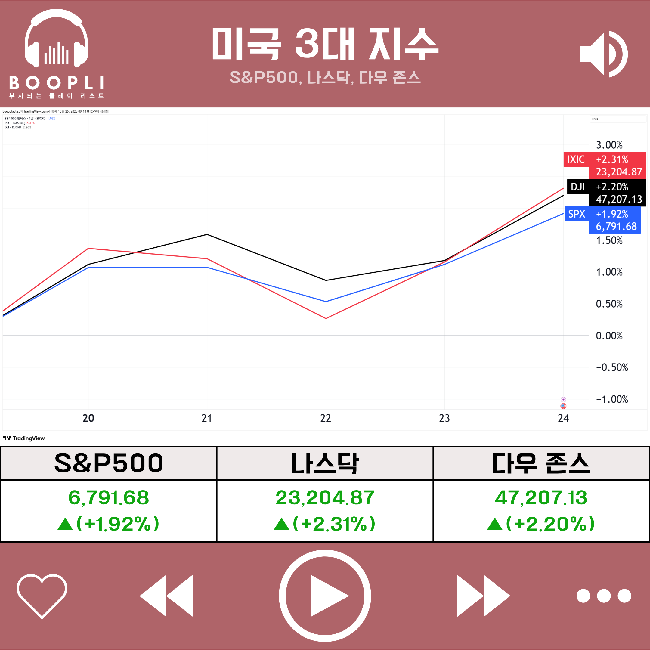 결과적으로 이번 주 미국 증시는 연준의 완화적 정책 기대와 실적 모멘텀, 무역 완화 분위기에 힘입어 신고가 랠리를 재개했으며, 주간 기준으로 S&P500은 +1.92%, 나스닥은 +2.31%, 다우 존스는 +2.20% 상승 마감했다.