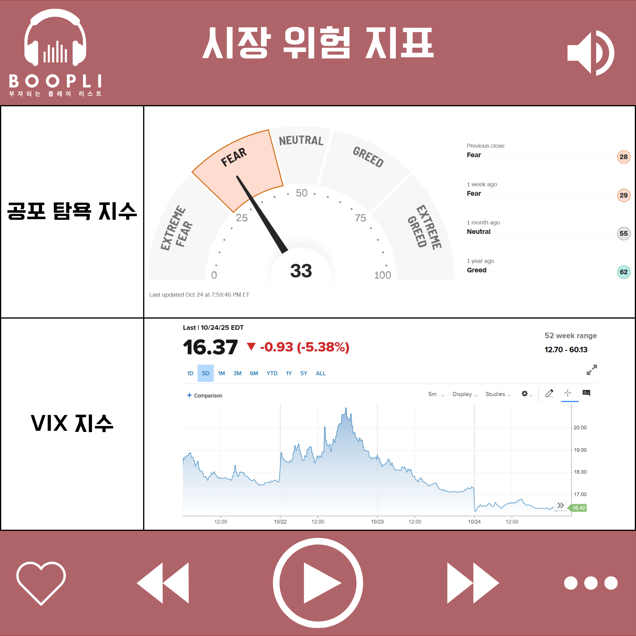 시장 변동성을 나타내는 VIX 지수는 1주일 전 대비 하락하며 번동성이 완화되었다.