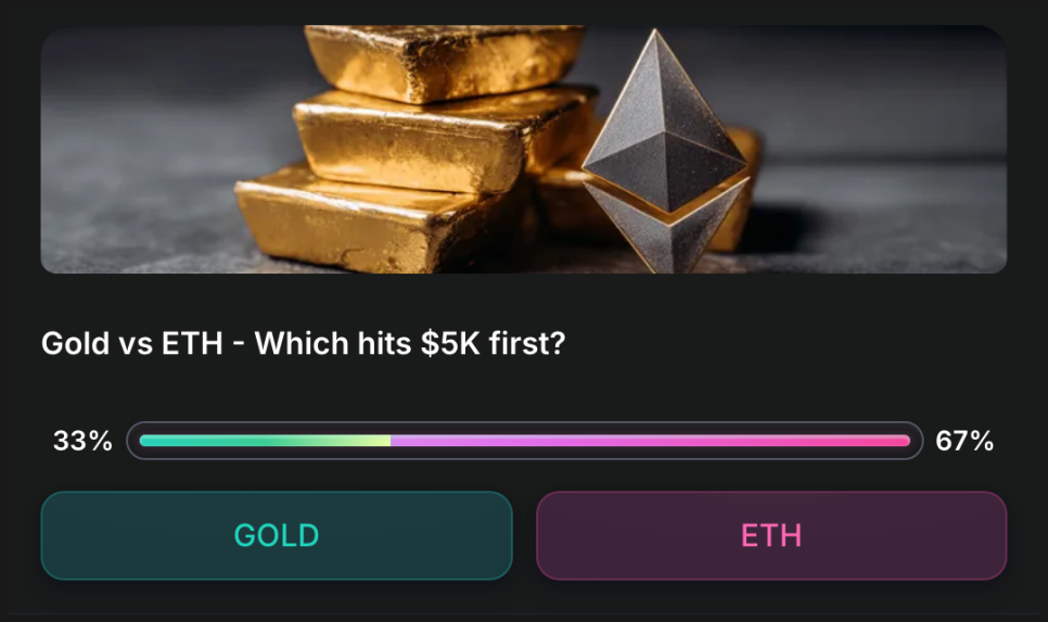 마이리어드(Myriad)라는 예측 시장 데이터를 보면 흥미로운 결과가 나옵니다. 현재 전체 자금의 67%가 ‘이더리움이 금보다 먼저 5,000달러를 돌파할 것’에 걸려 있습니다. 투자자들은 “금이 가격 면에서 목표치에 가까이 있지만 이더리움이 더 빠르다”는 데 베팅하고 있는 셈이죠.