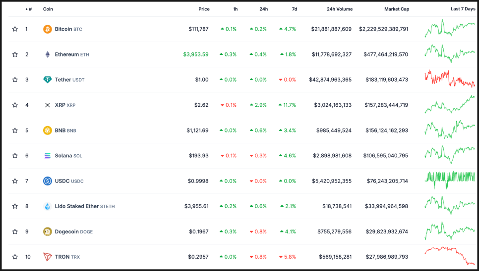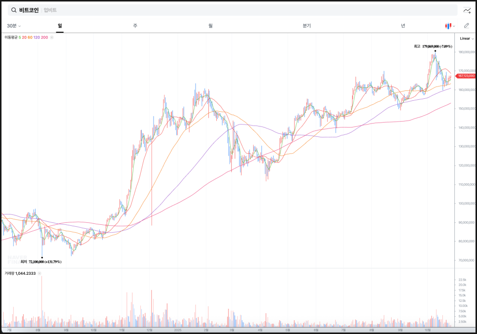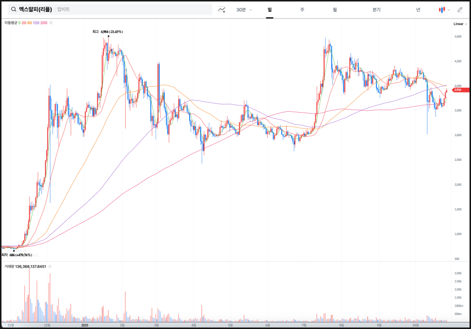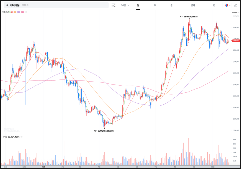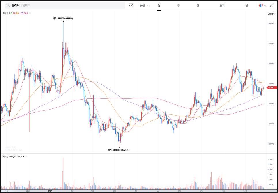 리플 역시 비슷한 구조를 보입니다. 2024년 하반기 저점 이후 가파른 상승세를 보이며 약 4,984원까지 치솟았고, 이후 긴 조정 흐름을 거쳤습니다. 2025년 상반기 내내 조정과 횡보가 이어졌지만, 200일선이 완만하게 상승 곡선을 그리면서 장기적인 추세는 무너지지 않았습니다. 현재 가격은 약 3,900원대이며, 단기선이 중기선과 맞물려 수렴하고 있어 솔라나와 마찬가지로 향후 방향성 돌파가 예상되는 전형적인 형태입니다. 특히 60일선과 120일선이 점차 가까워지고 있어, 추세 전환의 전조로 해석할 수 있는 구간입니다.
