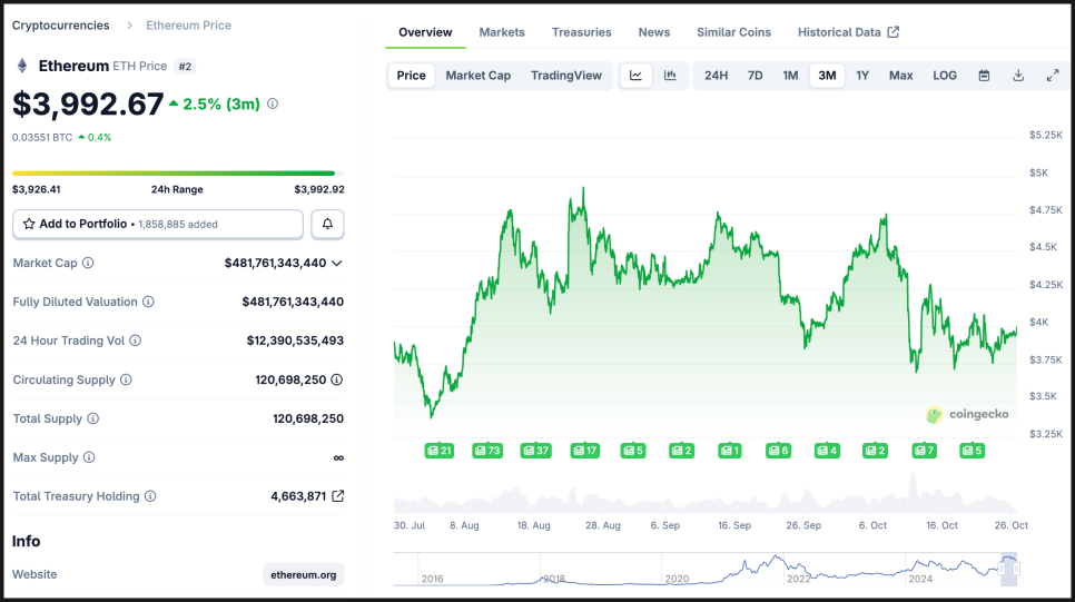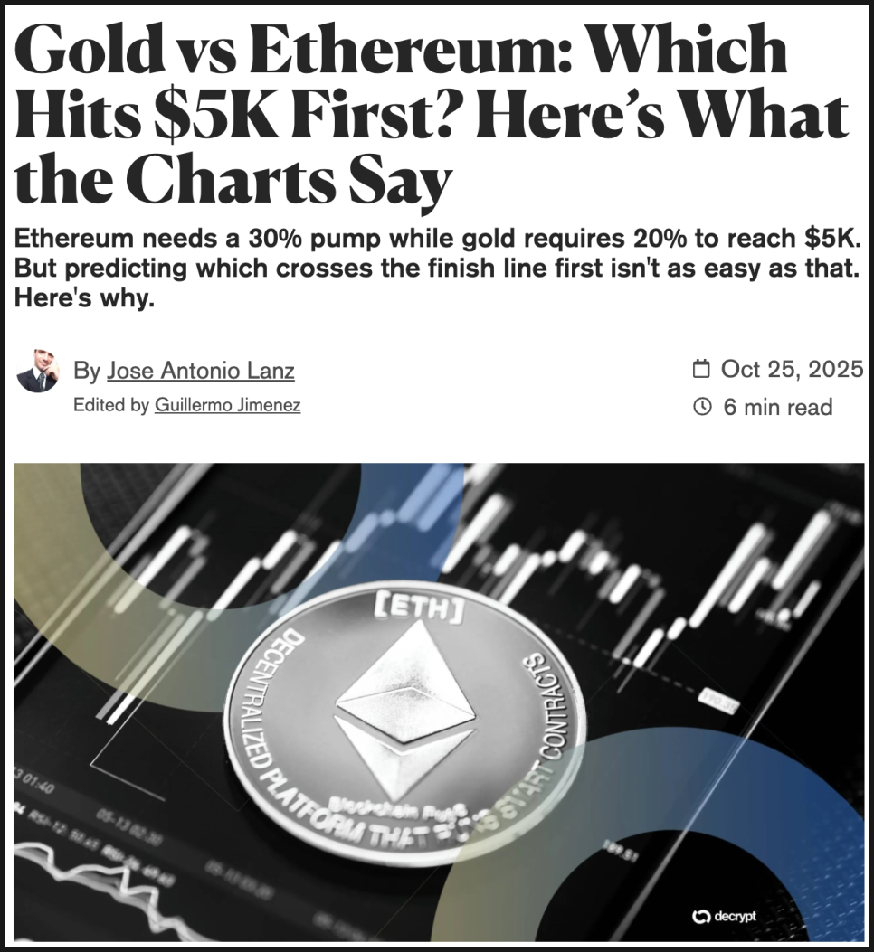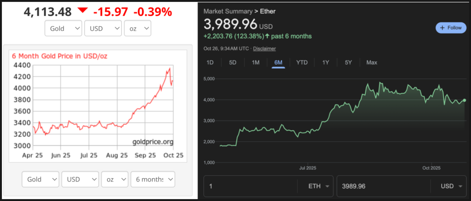 현재 금은 약 4,115달러 선에 머물고 있어 약 20%만 오르면 목표에 도달합니다. 이더리움은 약 3,900달러 근처에 있으며 30% 상승이 필요하죠. 수치만 보면 금이 유리해 보이지만, 시장은 늘 직선으로 움직이지 않습니다. 무엇보다 자산의 ‘움직임’과 ‘속도’ 자체가 완전히 다르기 때문입니다.