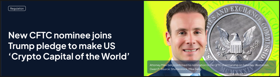 특히 최근 미국에서 중요한 변화가 감지되고 있습니다. 도널드 트럼프 미국 대통령이 미국 증권거래위원회(SEC) 산하 암호화폐 태스크포스의 수석 법률 고문인 마이클 셀리그를 상품선물거래위원회(CFTC) 위원장으로 지명했다는 보도가 블룸버그를 통해 나왔습니다. 셀리그는 2기 트럼프 행정부의 적극적인 친(親)암호화폐 규제 개편을 주도한 핵심 인물로 꼽히는 인물이죠.