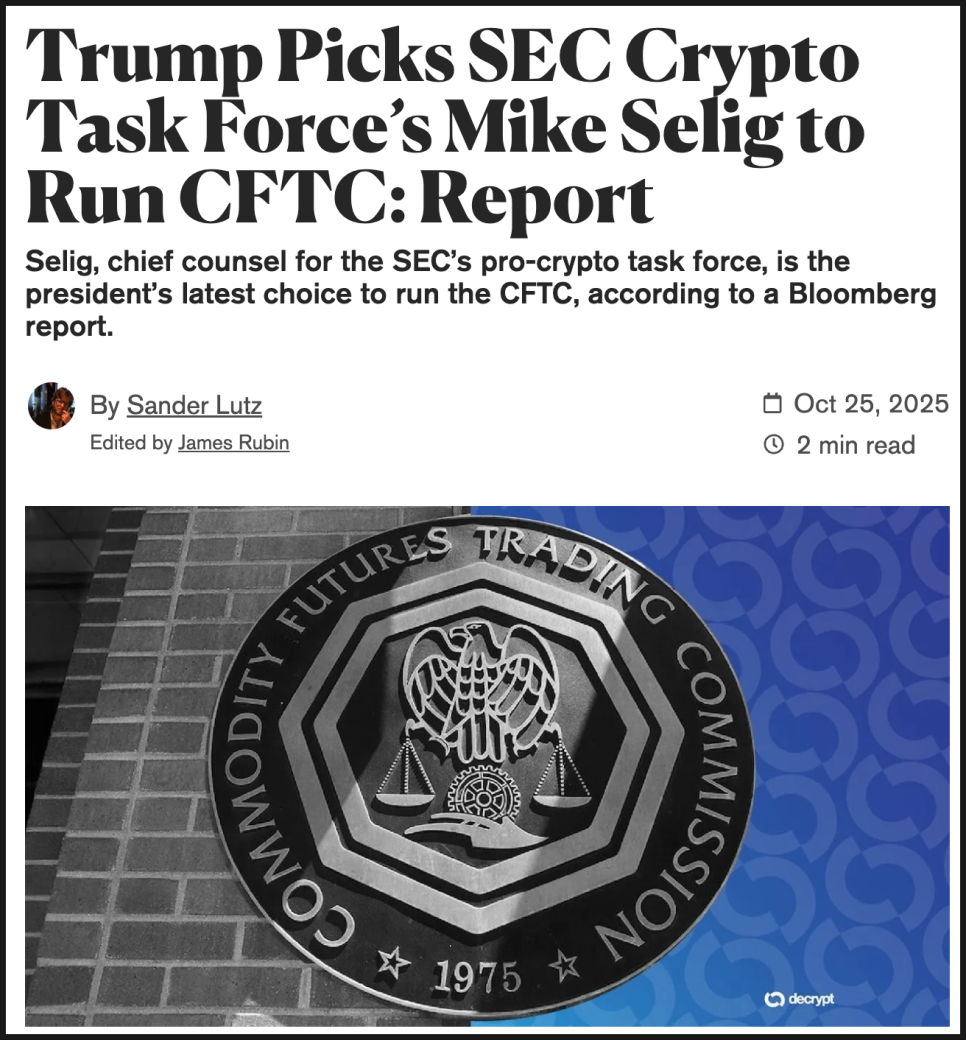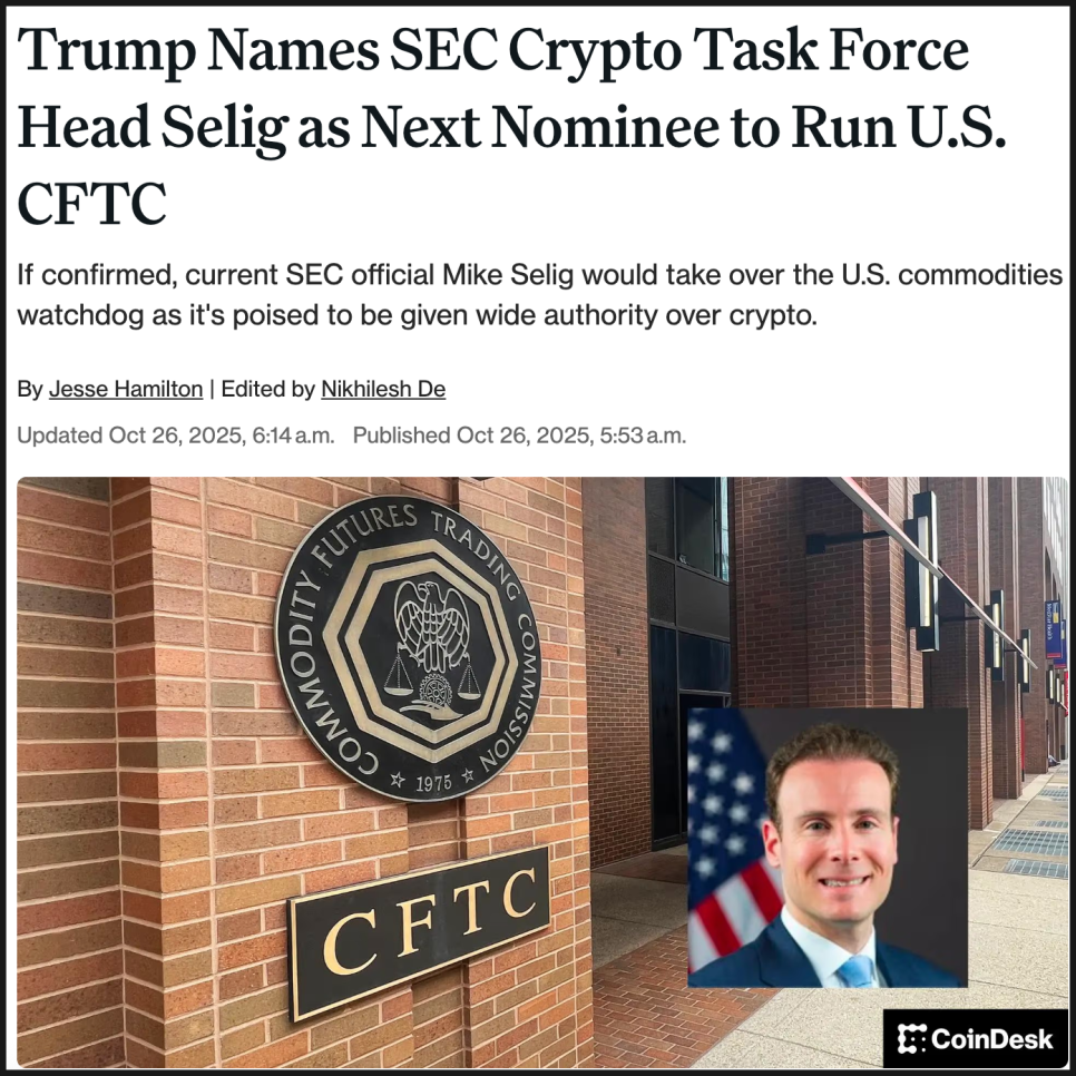 만약 셀리그가 실제로 CFTC를 이끌게 된다면, 미국의 암호화폐 규제 환경은 단순한 ‘허용’ 수준을 넘어 전략적 지원 단계로 진입할 가능성이 있습니다. 특히 예측시장(prediction market)이나 토큰화 예금(tokenized deposits) 등 새로운 시장 영역을 어떻게 다룰지가 큰 관전 포인트가 될 겁니다.
