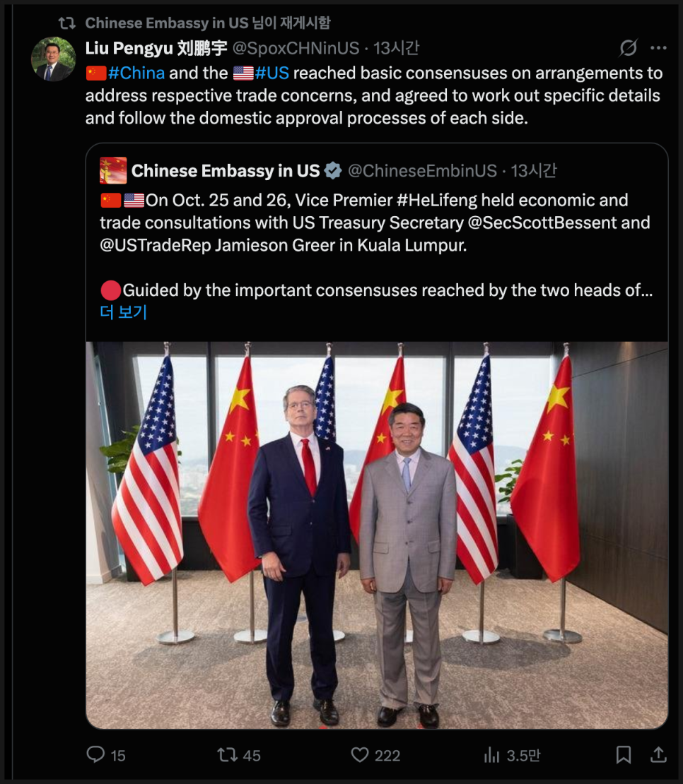 가격 상승에는 매크로(거시경제) 요인도 한몫했습니다. 같은 시간대 주미 중국 대사관은 부총리 He Lifeng(허리펑), 미국 재무장관 Scott Bessent(스콧 베센트), 무역대표 Jamieson Greer(제이미슨 그리어)가 참여한 쿠알라룸푸르 협상 결과를 전하며 “건설적인 대화가 있었다”고 발표했습니다.