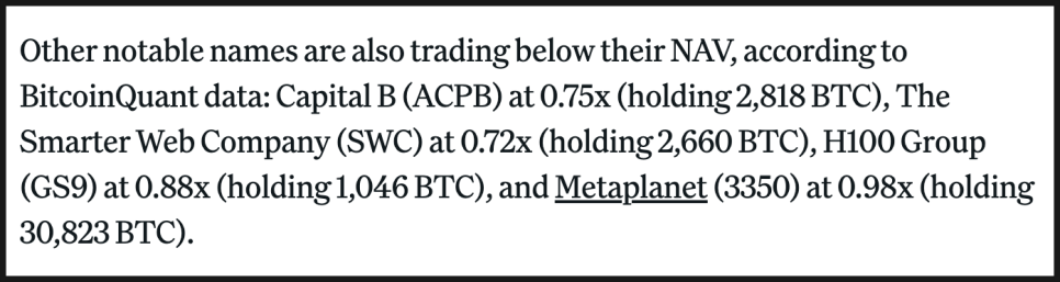 최근 비트코인을 핵심 자산으로 보유하고 있는 상장사들, 이른바 ‘비트코인 재무 기업’들의 주가가 자산 가치보다 낮게 형성되는 상황이 벌어지고 있습니다. 쉽게 말해 어떤 회사가 10억 달러어치의 비트코인을 갖고 있는데, 주식 시장에서는 이 회사를 7억 달러 수준으로만 평가하고 있는 겁니다.