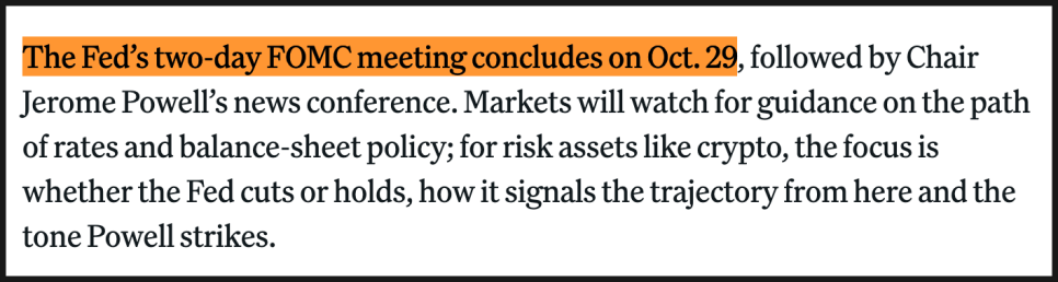여기에 Federal Reserve(미국 연방준비제도)의 연방공개시장위원회(FOMC) 회의도 시장의 방향을 결정할 핵심 이벤트로 꼽힙니다. 회의는 10월 29일에 마무리되고, 이어서 의장 Jerome Powell(제롬 파월)의 기자회견이 예정돼 있습니다.
