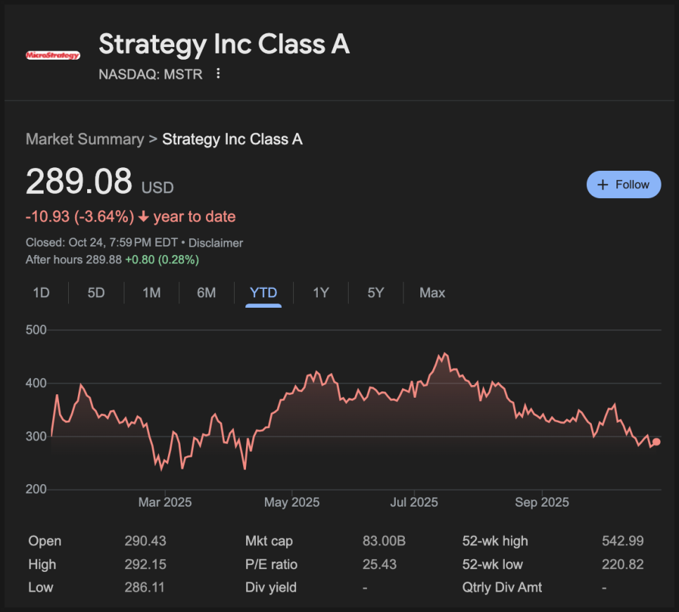 지금 주가는 285달러 수준까지 떨어졌지만, 보유 비트코인은 훨씬 늘었고 비트코인 가격도 60% 이상 올랐다는 점을 감안하면 프리미엄이 얼마나 줄어들었는지 확연히 보입니다. 이 역시 시장의 분위기가 전체적으로 식어 있다는 걸 보여주는 단면입니다.