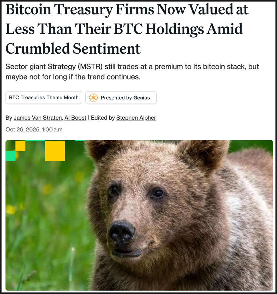 이런 현상을 측정할 때 자주 쓰이는 지표가 ‘mNAV’인데요. 기업의 시가총액을 보유한 비트코인 자산 가치와 비교한 수치입니다. mNAV가 1.0 미만으로 떨어졌다는 건, 시장이 그 기업의 자산 가치보다 낮게 평가하고 있다는 뜻입니다. 예전에는 시장이 프리미엄을 얹어 평가했지만, 최근에는 분위기가 완전히 바뀌었습니다.