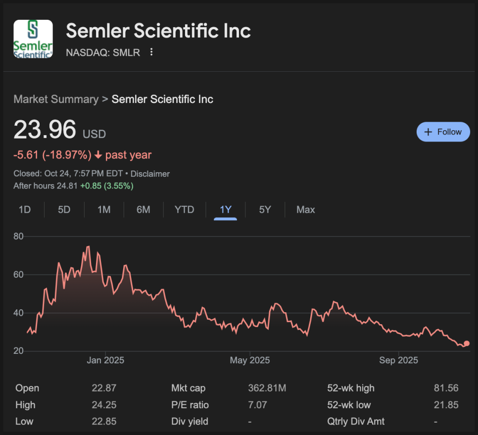 지금은 대부분의 상위 20개 비트코인 재무 기업이 자산가치보다 낮은 가격에 거래되고 있습니다. Semler Scientific(셈러 사이언티픽)은 2024년 중반부터 5,000개가 넘는 비트코인을 보유했지만, 주가는 당시 수준과 비슷한 24달러에 머물고 있고, mNAV는 0.80 수준으로 떨어졌습니다.