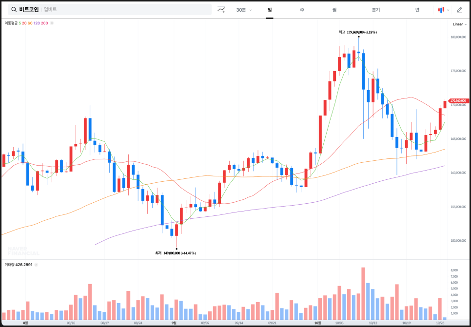 8월~9월의 긴 하락세와 달리 200일선(보라색) 아래로 밀리지 않았다는 점은 기술적으로 긍정적인 신호로 해석할 수 있습니다. 다만 직전 고점 부근인 1억 8000만 원대가 강한 저항 구간으로 작용하고 있기 때문에, 이 가격대를 돌파할 수 있느냐가 다음 방향성을 결정할 핵심 포인트가 될 가능성이 높습니다.