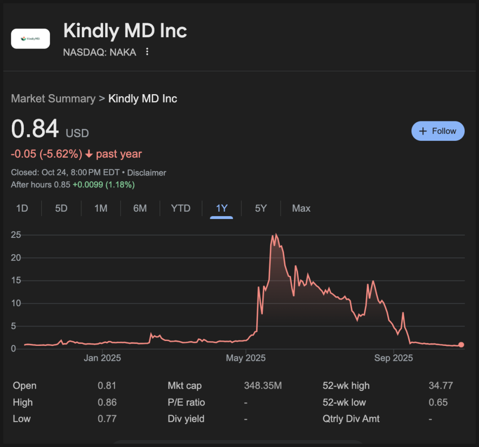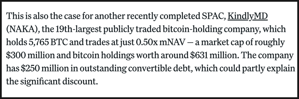 KindlyMD(킨들리MD) 역시 5,765 BTC를 보유하고 있지만 mNAV는 0.50에 불과합니다. 2억 5천만 달러 규모의 전환사채도 투자자들의 신뢰를 깎는 요인이 되고 있습니다.