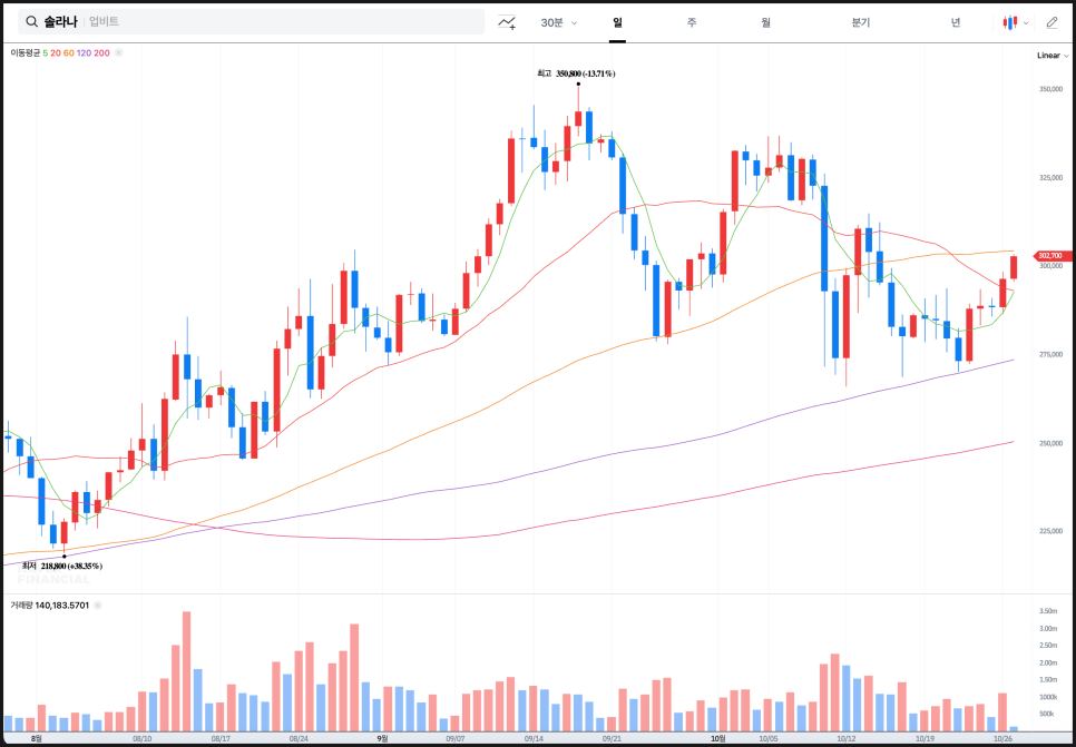 솔라나는 8월부터 상승세를 이어오다 9월 중순 35만 원 부근에서 고점을 찍고 조정에 들어갔습니다.