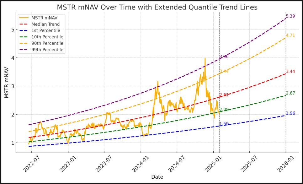 이 와중에 MicroStrategy(마이크로스트래티지)만은 여전히 프리미엄을 유지하고 있습니다. 현재 mNAV는 1.33 수준인데요, 2024년 말 주가가 543달러까지 올랐을 때는 거의 3배 프리미엄이 붙어 있었습니다.