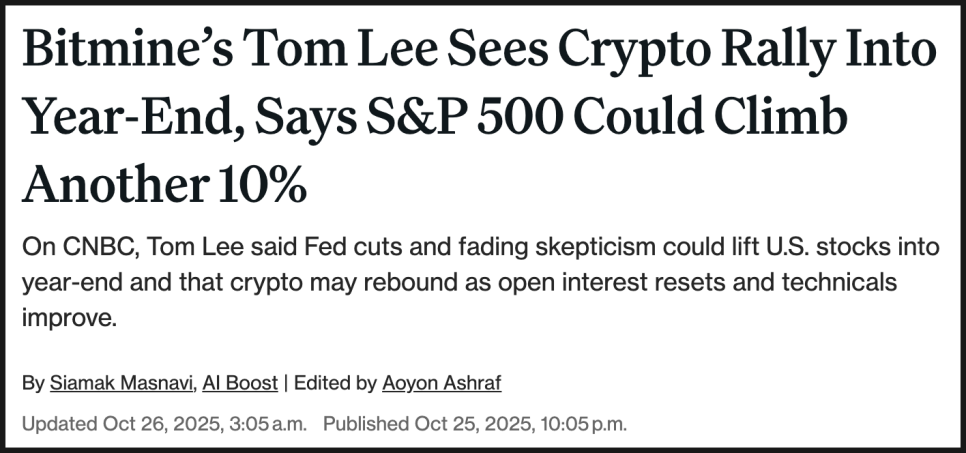 그럼에도 시장 전체가 비관론으로만 움직이는 건 아닙니다. Tom Lee(톰 리), Bitmine Immersion Technologies(비트마인 이머전 테크놀로지) 회장이자 Fundstrat Global Advisors(펀드스트랫 글로벌 어드바이저스) 리서치 총괄은 올해 연말 주식과 암호화폐 시장 모두 강하게 반등할 가능성이 높다고 진단했습니다.