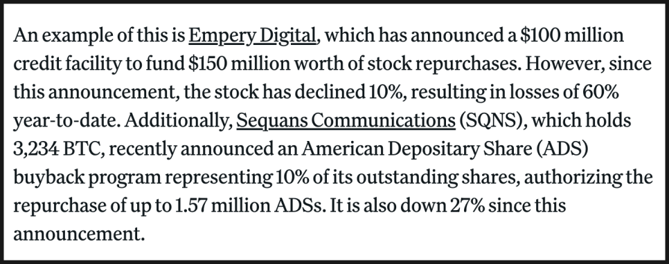 일부 기업은 비트코인을 조금씩 매도해 매입 재원을 마련하고, 일부는 보유 자산을 담보로 대출을 받아 자사주 매입을 시도하고 있습니다. Empery Digital(엠페리 디지털)은 1억 달러 규모의 신용 한도를 열어 1억 5천만 달러어치 자사주를 매입하겠다고 발표했습니다. Sequans Communications(시콴스 커뮤니케이션즈) 역시 전체 주식의 10% 규모 자사주 매입 프로그램을 발표했지만, 시장 반응은 냉담했습니다.