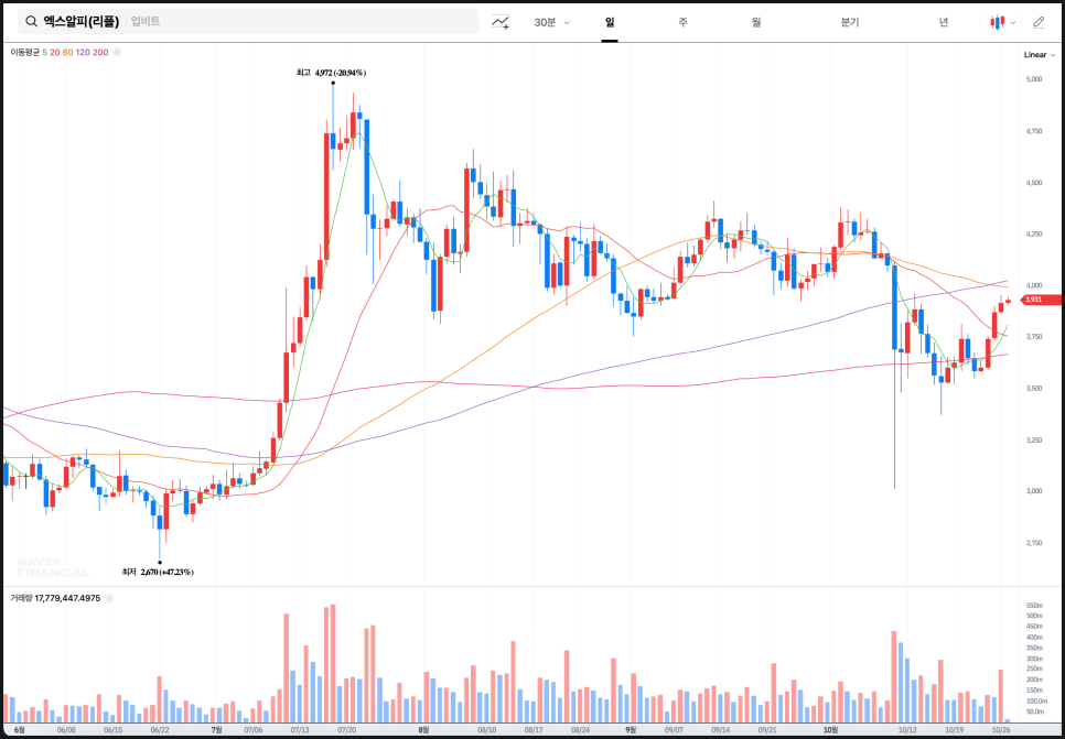 엑스알피(XRP)는 여름에 2,570원 부근에서 시작된 상승세가 7월 중순 급등으로 이어지면서 4,972원까지 치솟았고, 이후 장기 조정 구간에 진입했었습니다.