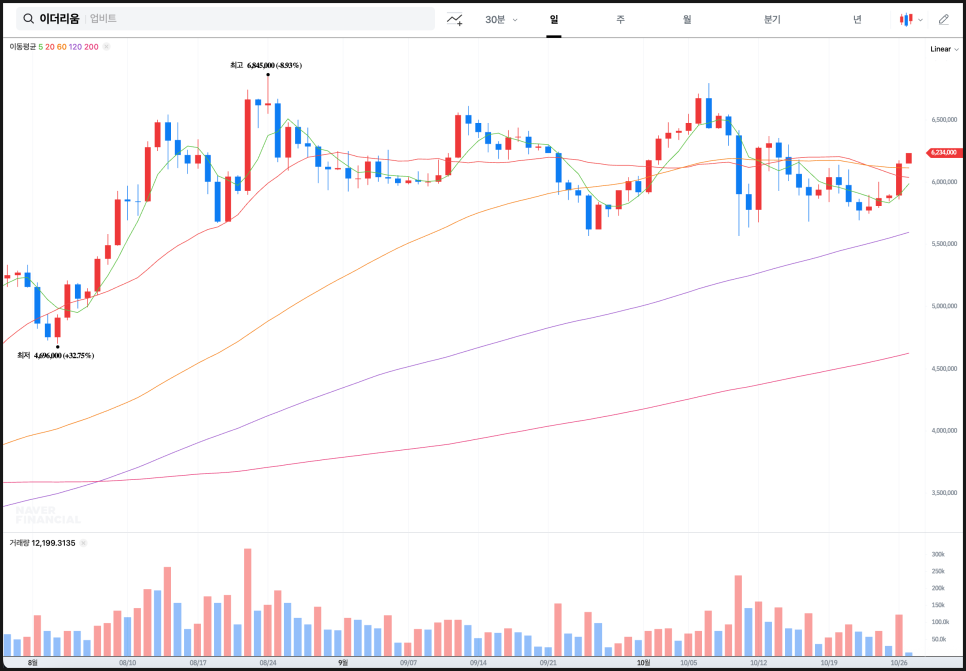 8월 초 460만 원대에서 시작된 상승세는 680만 원대까지 이어졌지만, 그 이후 강한 추세가 나오지 못하고 횡보가 길어졌습니다. 이 구간에서 60일선과 120일선이 캔들 흐름을 눌러온 흔적이 보이는데요, 단기 상승 모멘텀이 약해진 상황이었죠.