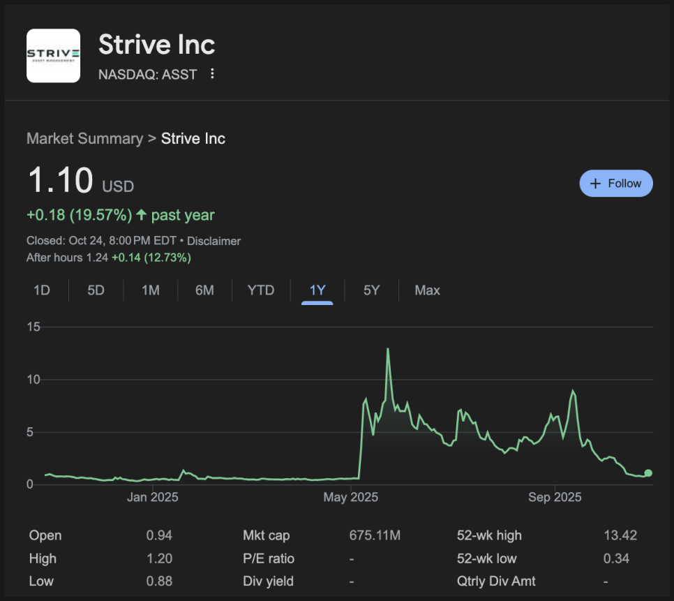 이 회사를 인수한 Strive(스트라이브)의 상황은 더 심각합니다. SPAC 상장을 마친 지 한 달도 안 돼 주가가 90% 가까이 폭락하면서 보유 비트코인의 절반가치 수준으로만 평가받고 있습니다.