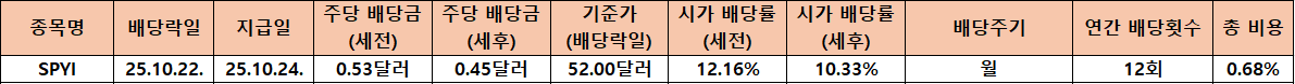 SPYI는 2025년 10월 기준 주당 배당금이 0.53달러로 전년 동기(0.51달러) 대비 3.29% 증가했습니다. 단기 변동은 존재하지만 최근 2년간 배당이 매월 꾸준히 이어지고 있으며 배당 성장률도 평균 3%대를 유지하고 있습니다. 특히 2024년 하반기 이후부터는 분기별로 0.02~0.03달러 수준의 상승 폭을 보이며 꾸준한 인상 기조를 유지하고 있다는 점이 인상적입니다.