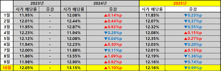 시가배당률(세전)은 12.16%로 여전히 높은 수준이며 세후 기준으로도 10.33% 수준을 유지하고 있습니다. 이는 고배당 ETF 중에서도 상위권 수준으로 배당금 흐름이 안정적으로 유지된다는 점에서 장기 보유자에게 유리한 구조입니다. 다만 주가 상승으로 인해 시가배당률은 전년 대비 약 0.99%p 하락했습니다. 이는 배당금 자체가 줄었기 때문이 아니라 주가가 더 큰 폭으로 상승했기 때문으로 해석됩니다.