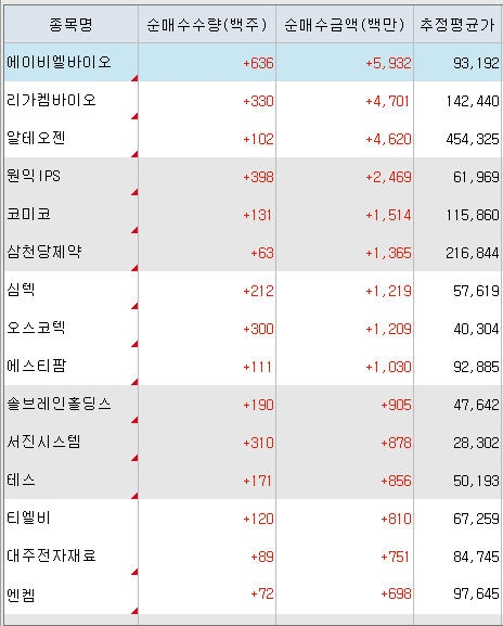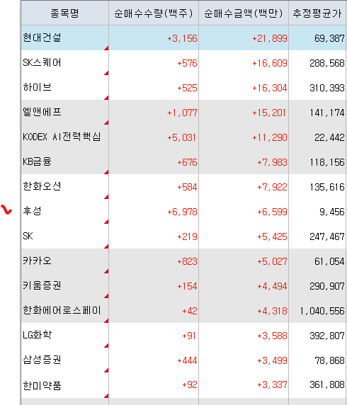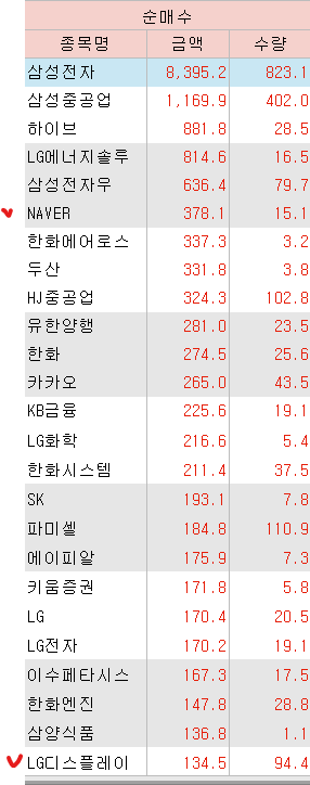 외국인은 KOSPI에서 순매수(+5,939억원, 그러나 선물은 -13,590억원을 매도- 현물 매수는 주가상승을 기대, 선물 매도는 단기 하락에 대비한 헤지포지션). 외국인은 전기·전자와 운송장비·부품 업종을 매수했고, 건설과 금속 업종을 매도