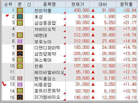 한미약품, 보로노이 등이 신약 출시 계획을 발표하며 바이오주 오름세(한미약품 +26.84%, 삼천당제약 +13.45%, 에이비엘바이오 +12.15%, 리가켐바이오 +9.19%, 알테오젠 +9.19%, SK바이오팜 +8.92%)